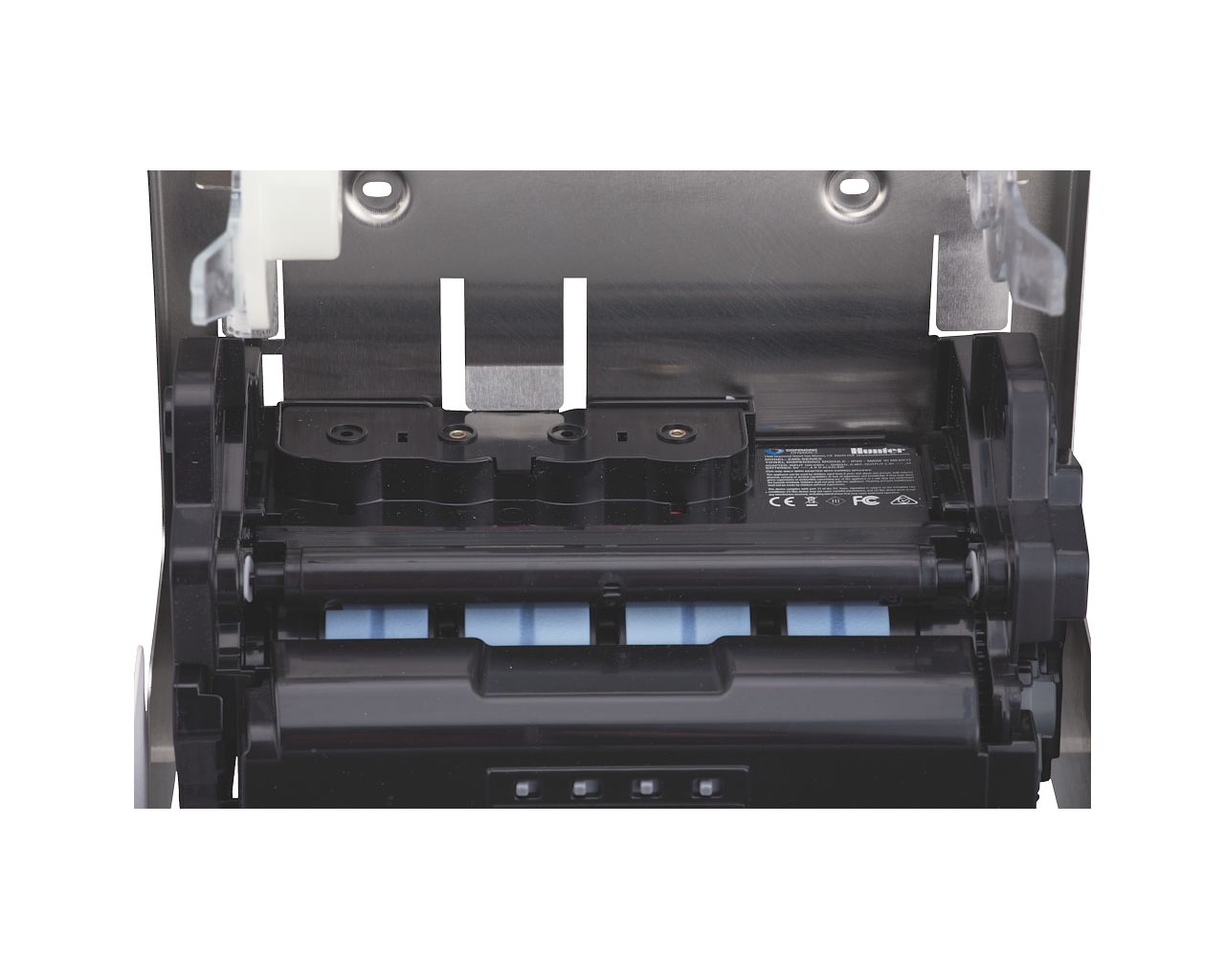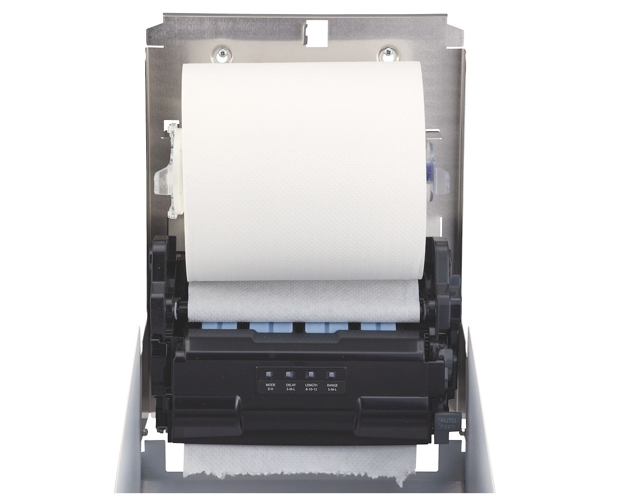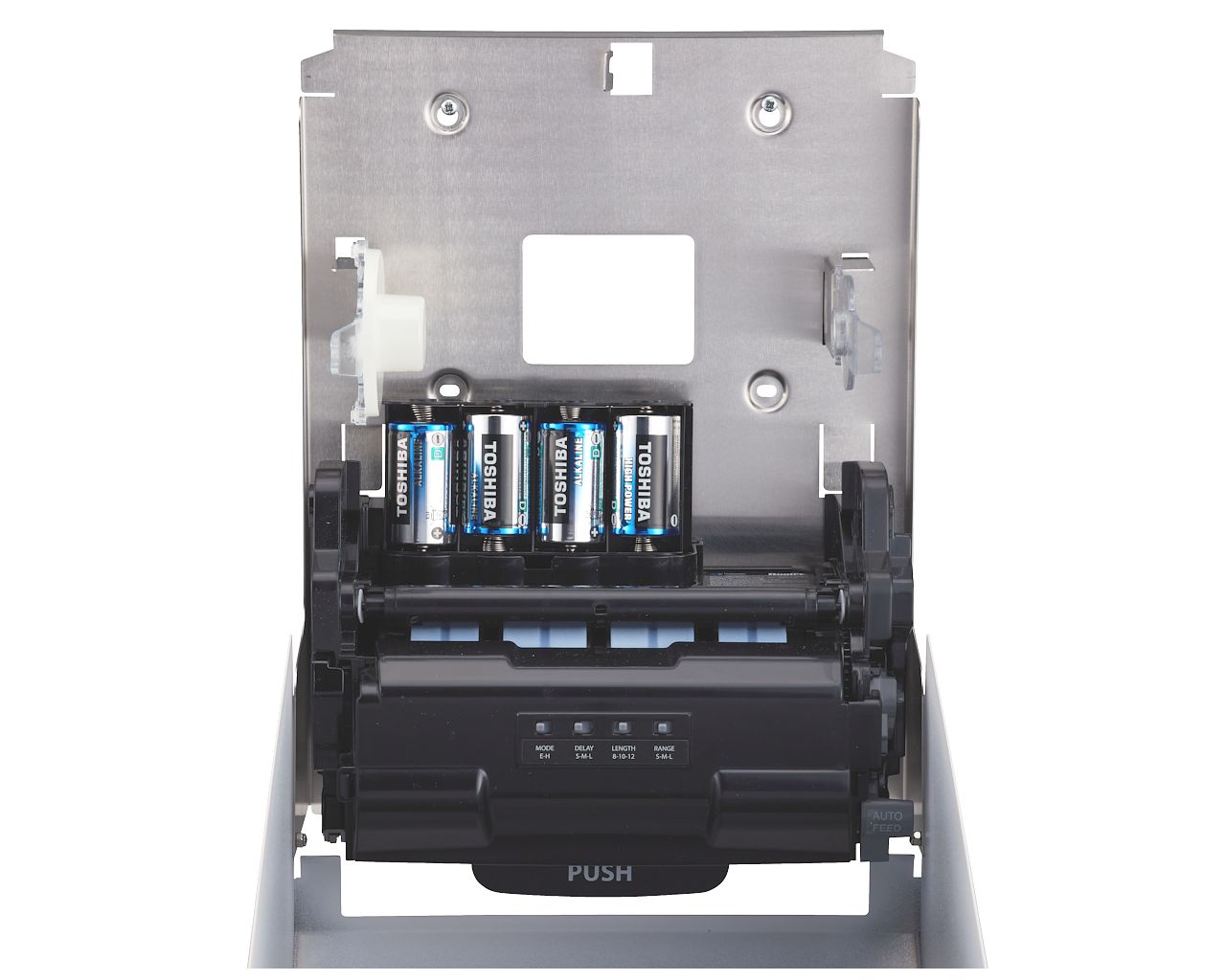 Podajnik ręczników zasilany jest 4 bateriami alkalicznym R20 (baterie dołączone) lub zasilaczem sieciowym. Zasilacz chowany wewnątrz urządzenia w miejscu kasety na baterie, zasilacz można podłączyć bezpośrednio do puszki elektrycznej za urządzeniem (zasilacz kupowany osobno). W urządzeniu łatwo zakłada się nową rolkę papieru z wykorzystaniem wewnętrznego przycisku AUTO FEED do automatycznego nawinięcia papieru na rolki. Diodowy wskaźnik stanu urządzenia, umiejscowiony w dolnej części podajnika, migając na niebiesko sygnalizuje gotowość do pracy, migając na czerwono co 5 sekund sygnalizuje słabe baterie, świecąc stale na czerwono sygnalizuje wyczerpane baterie, migając pulsacyjnie na czerwono sygnalizuje zakleszczenie papieru w urządzeniu. W podajniku jest łatwy dostęp do mechanizmu tnącego umożliwiający bezproblemowe czyszczenie oraz konserwację urządzenia. Wykonany ze stali nierdzewnej. Obudowa pokryta specjalną strukturalną białą powłoką. Podajnik ręczników zabezpieczony jest trwałym stalowym zamkiem bębenkowym. Zamek zlicowany z powierzchnią urządzenia. Łączenia boków podajnika ręczników są spawane i szlifowane. Urządzenie posiada niewidoczne zawiasy. Zamykany na kluczyk.
