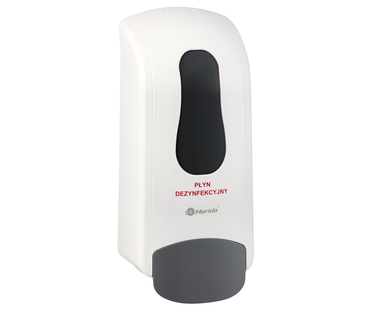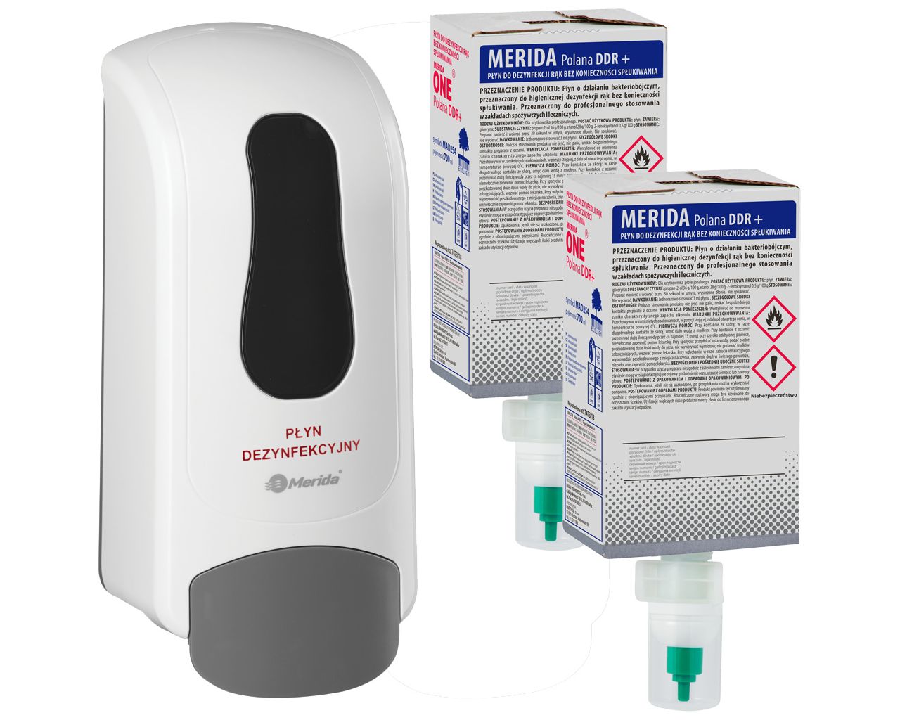 Dozownik płynu dezynfekującego MERIDA ONE biały i dwa wkłady płynu dezynfekującego w promocyjnej cenie.
