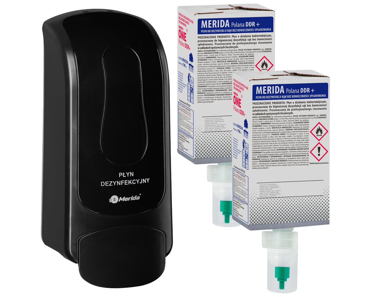 Dozownik płynu dezynfekcyjnego MERIDA ONE czarny i dwa wkłady płynu dezynfekującego