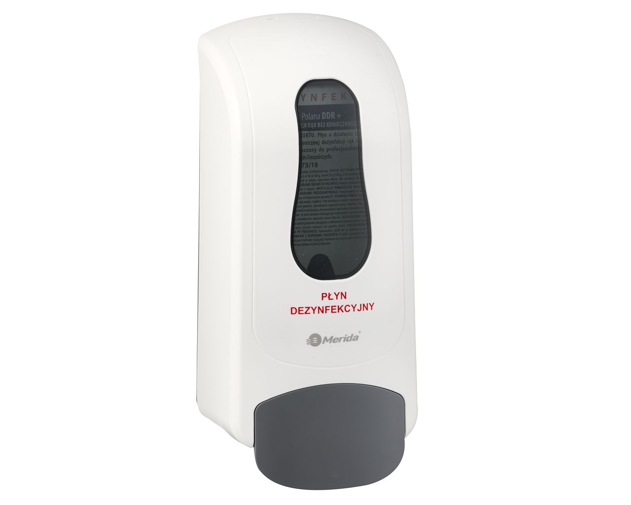 Dozownik płynu dezynfekcyjnego MERIDA ONEna jednorazowe wkłady 700 ml z płynem dezynfekcyjnym MERIDA POLANA DDR+, tworzywo ABSbiały