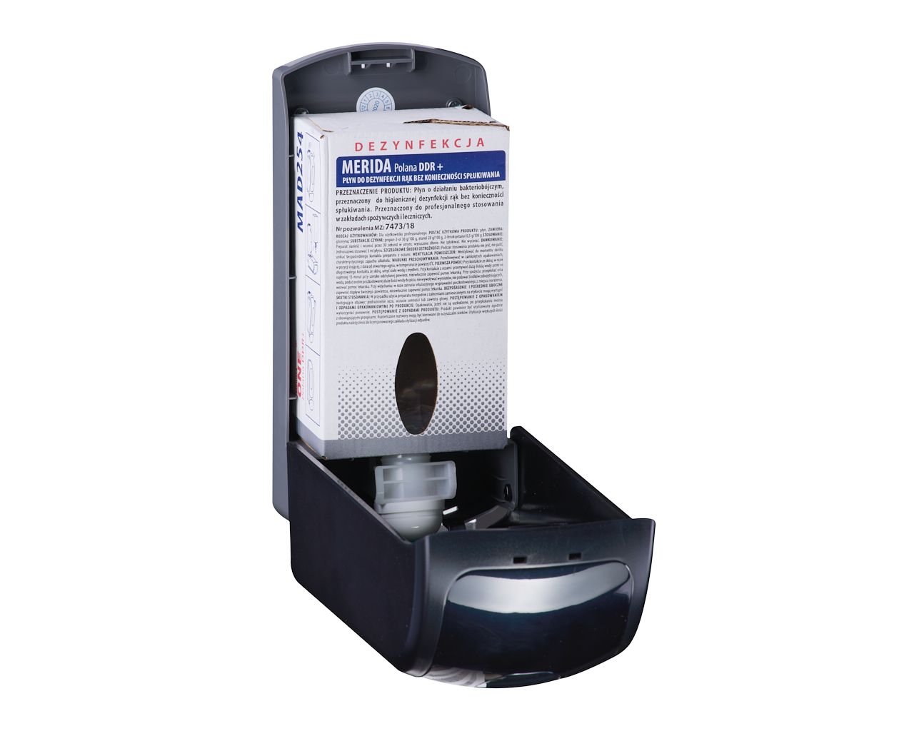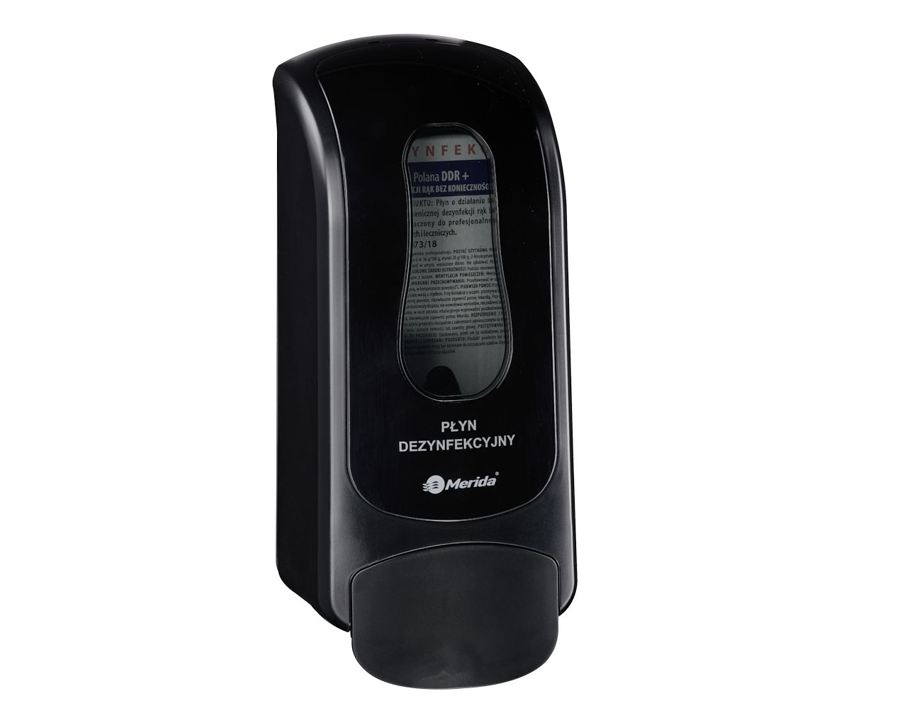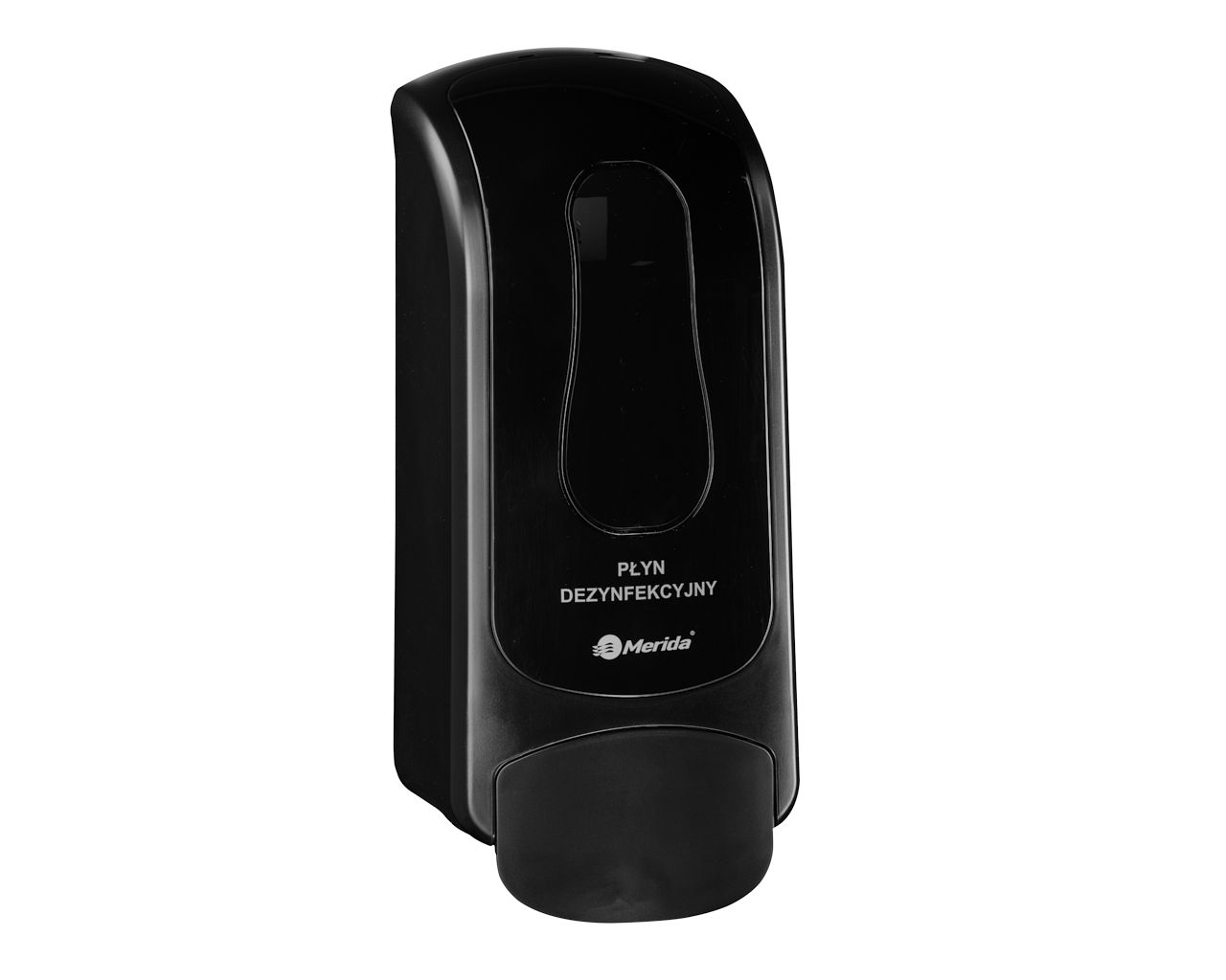 Dozownik płynu dezynfekcyjnegoMERIDA ONE na jednorazowe wkłady 700 ml z płynem dezynfekcyjnym MERIDA POLANA DDR+, tworzywo ABSczarny