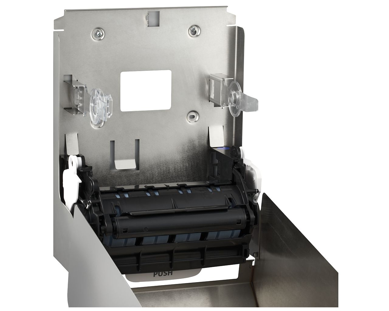 Mechaniczny podajnik ręczników papierowych zapewnia higieniczne użytkowanie, dotykany jest tylko pobierany ręcznik. Pobranie ręcznika uruchamia mechanizm odcinający listek o długości 25,5 cm. Urządzenie charakteryzuje się cichą i delikatną pracą mechanizmu odcinającego. W sytuacji awaryjnej ręcznik można wysunąć przez naciśnięcie dźwigni PUSH, znajdującej się w dolnej części podajnika. Uchwyt rolki wyposażony w system ułatwiający zakładanie ręcznika. Podajnik posiada łatwy dostęp do mechanizmu tnącego umożliwiający bezproblemowe czyszczenie oraz konserwację urządzenia. Wykonany ze stali nierdzewnej szczotkowanej (matowej). Podajnik ręczników zabezpieczony jest trwałym stalowym zamkiem bębenkowym. Zamek zlicowany z powierzchnią urządzenia. Łączenia boków podajnika ręczników są spawane i szlifowane. Urządzenie posiada niewidoczne zawiasy, obudowa i tylna ścianka wykonana ze stali nierdzewnej. Zamykany na kluczyk.