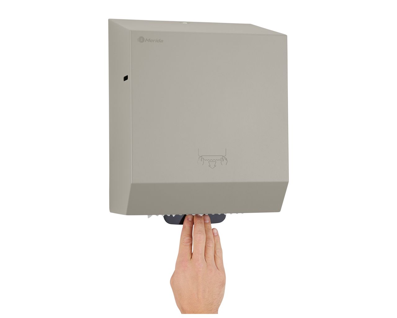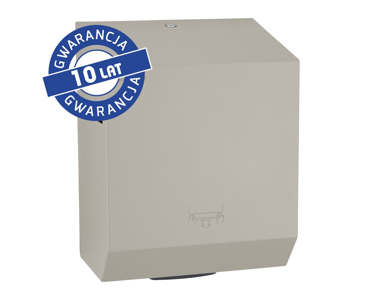 Mechaniczny podajnik ręczników papierowych zapewnia higieniczne użytkowanie, dotykany jest tylko pobierany ręcznik. Pobranie ręcznika uruchamia mechanizm odcinający listek o długości 25,5 cm. Urządzenie charakteryzuje się cichą i delikatną pracą mechanizmu odcinającego. W sytuacji awaryjnej ręcznik można wysunąć przez naciśnięcie dźwigni PUSH, znajdującej się w dolnej części podajnika. Uchwyt rolki wyposażony w system ułatwiający zakładanie ręcznika. Podajnik posiada łatwy dostęp do mechanizmu tnącego umożliwiający bezproblemowe czyszczenie oraz konserwację urządzenia. Wykonany ze stali nierdzewnej. Obudowa pokryta specjalną strukturalną kamienno szarą powłoką. Podajnik ręczników zabezpieczony jest trwałym stalowym zamkiem bębenkowym. Zamek zlicowany z powierzchnią urządzenia. Łączenia boków podajnika ręczników są spawane i szlifowane. Urządzenie posiada niewidoczne zawiasy. Zamykany na kluczyk.