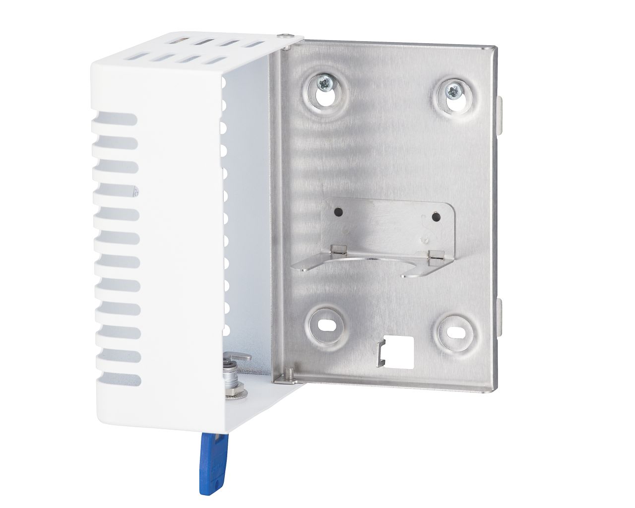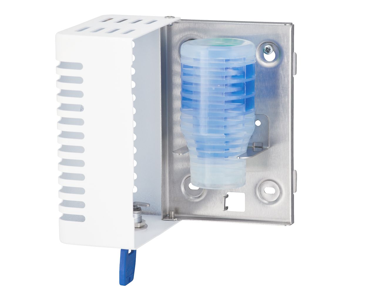 wymuszoną jedynie przez naturalną cyrkulację powietrza w pomieszczeniu (bez baterii, bez aerozoli, bez emisji szkodliwych gazów). Wykonany ze stali nierdzewnej pokrytej specjalną strukturalną białą powłoką. Zabezpieczony trwałym stalowym zamkiem bębenkowym, zamek zlicowany z powierzchnią urządzenia. Łączenia boków spawane i szlifowane, niewidoczne zawiasy. Zamykany na kluczyk. Możliwość montażu na ścianie lub używania jako urządzenie wolnostojące.