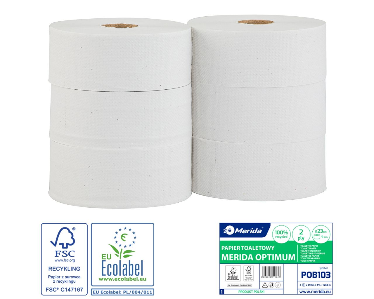Papier toaletowy MERIDA OPTIMUMbiały, średnica 23 cm, długość 210 m, dwuwarstwowy, zgrzewka 6 szt.ECOLABEL