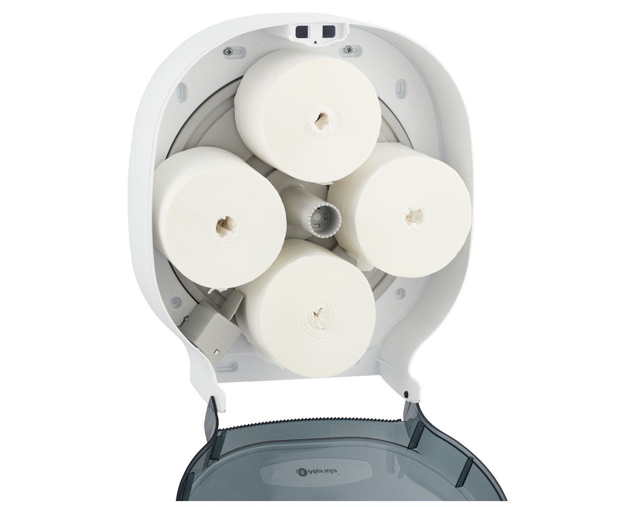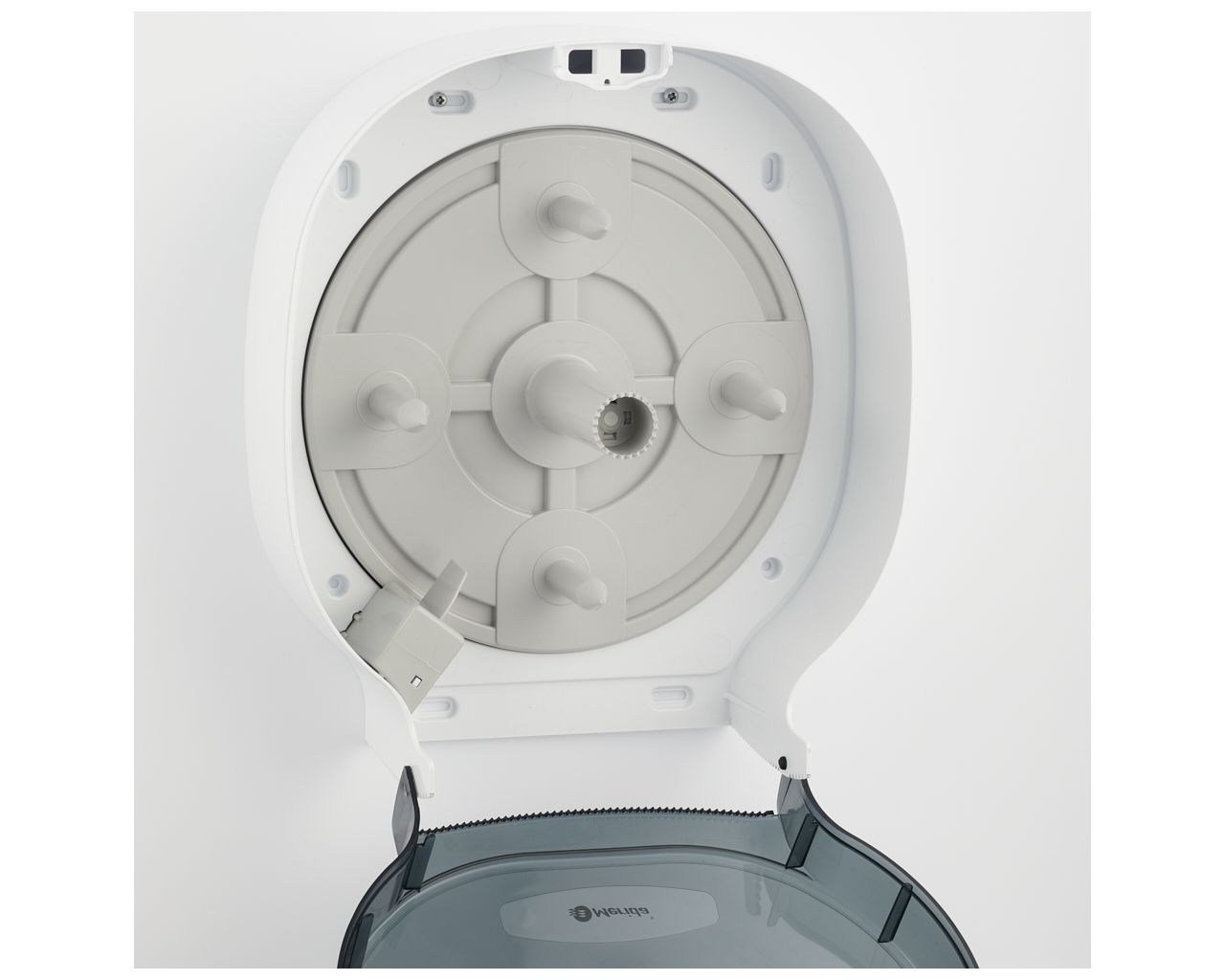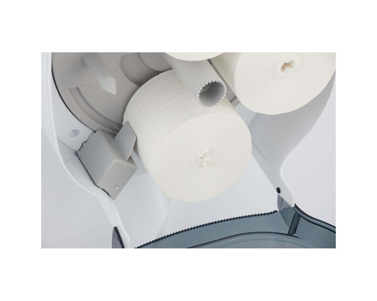 – dzięki specjalnemu mechanizmowi, kolejna rolka papieru dostępna jest dopiero po zużyciu tej obecnie używanej, co eliminuje problem pozostających końcówek rolki