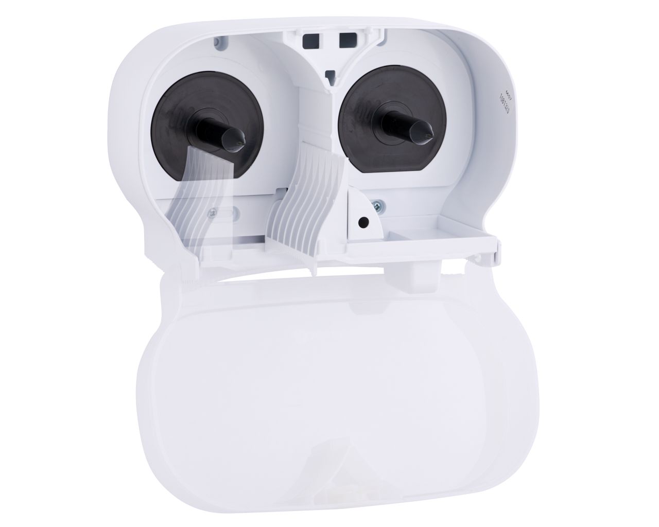 – dzięki specjalnemu mechanizmowi, kolejna rolka papieru dostępna jest dopiero po zużyciu tej obecnie używanej, co eliminuje problem pozostających końcówek rolki