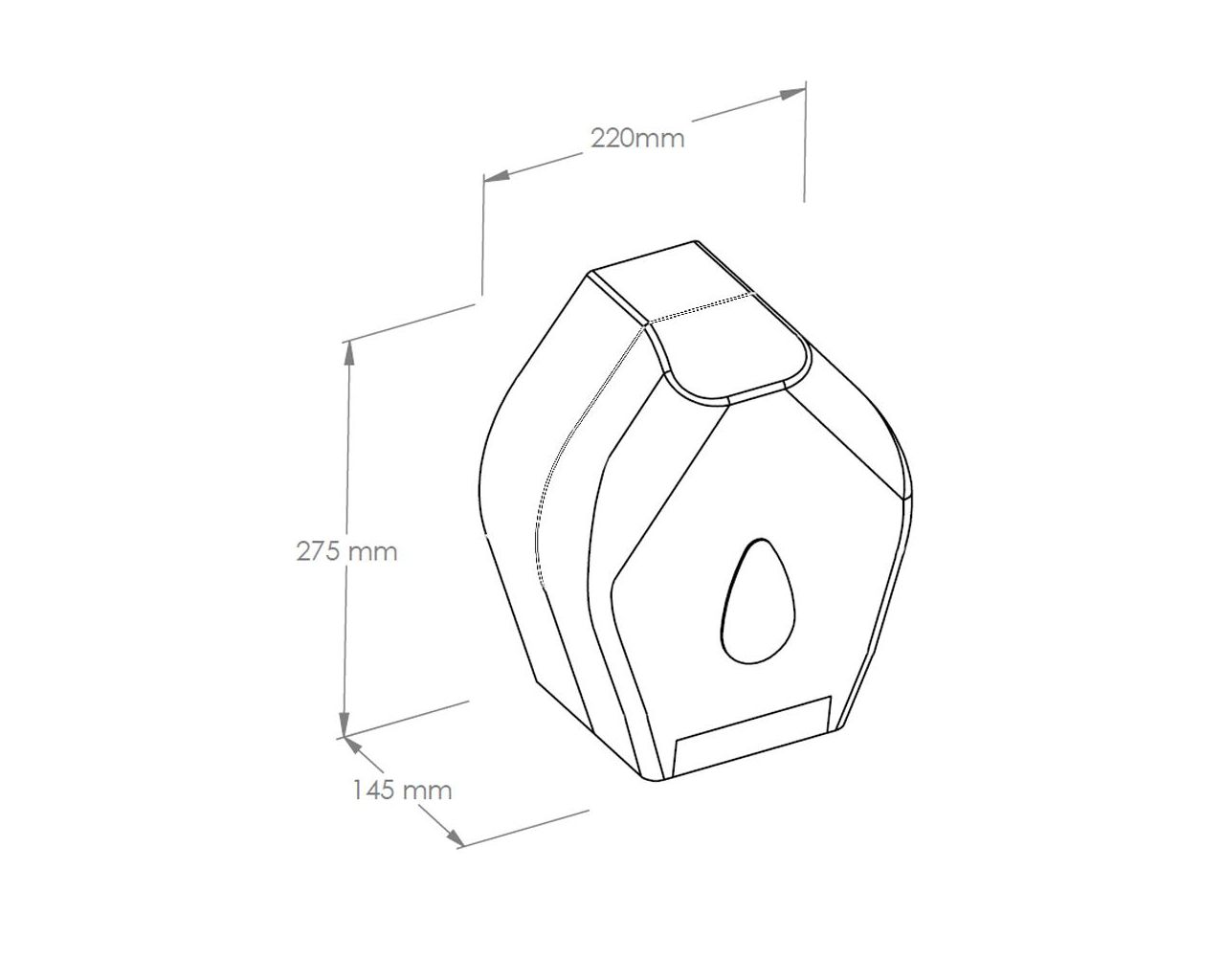 Pojemnik wykonany z wysokiej jakości tworzywa ABS. Odporny na działanie UV. Posiada ozdobne okienko w kolorze szarym, które umożliwia kontrolę ilości papieru w pojemniku. Można w nim stosować papier o maksymalnej średnicy roli 19 cm. Pojemnik zamykany na kluczyk.