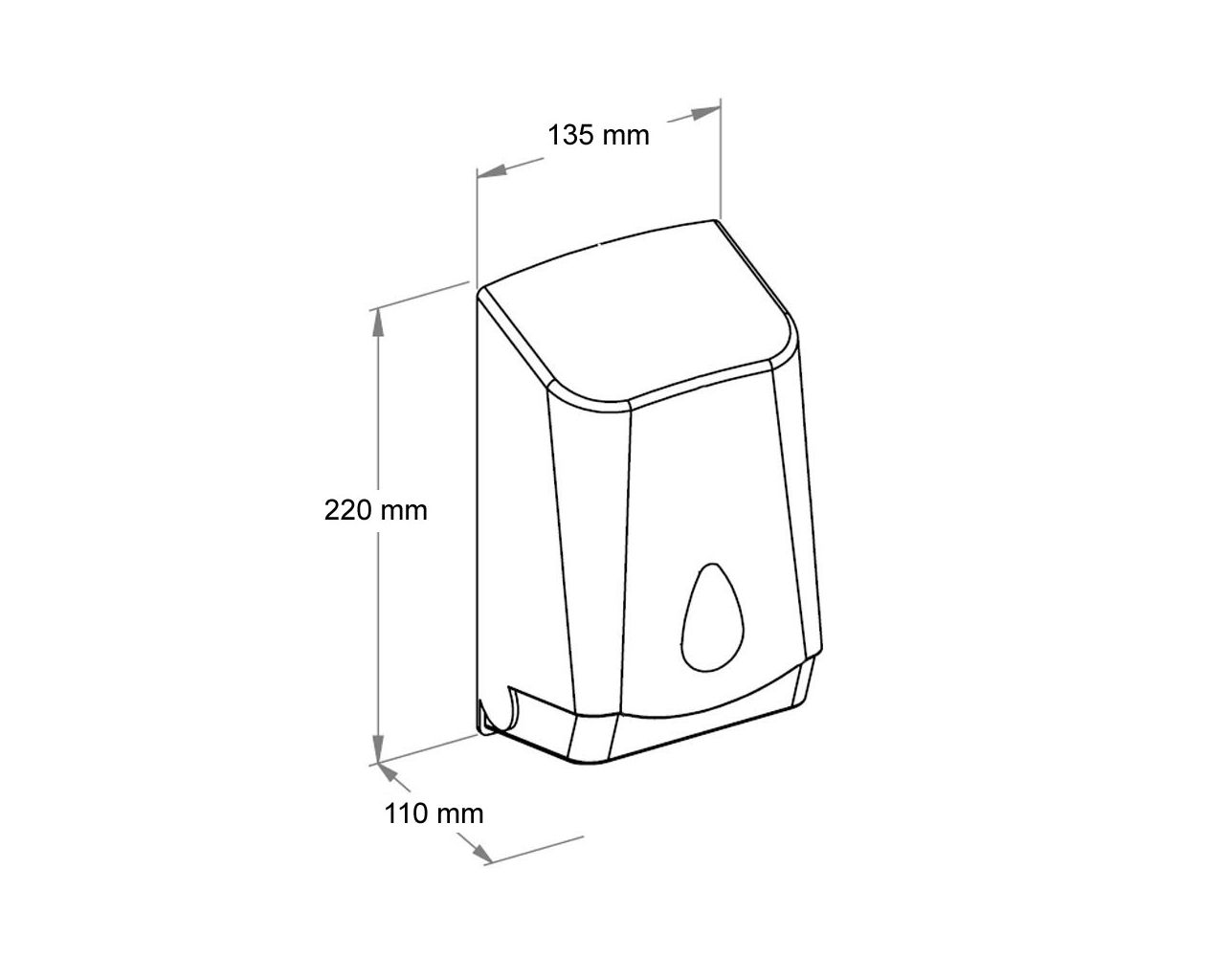 Pojemnik wykonany z wysokiej jakości tworzywa ABS o pojemność do 400 szt. listków papieru. Dostosowany do użytkowania z papierem toaletowym w listkach. Zaopatrzony w ozdobne, ciemnoszare okienko umożliwiające kontrolę ilości papieru w pojemniku. Odporny na działanie UV. Pojemnik zamykany na kluczyk.