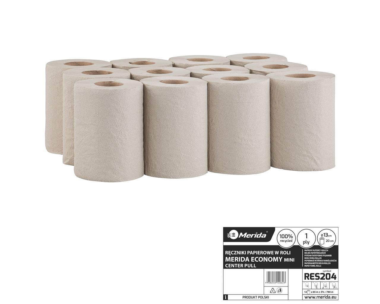 Ręczniki papierowe w roliMERIDA ECONOMY CENTER PULL MINI, jednowarstwowe, szare, średnica 13,5 cm, długość 60 mzgrzewka 12 rolek