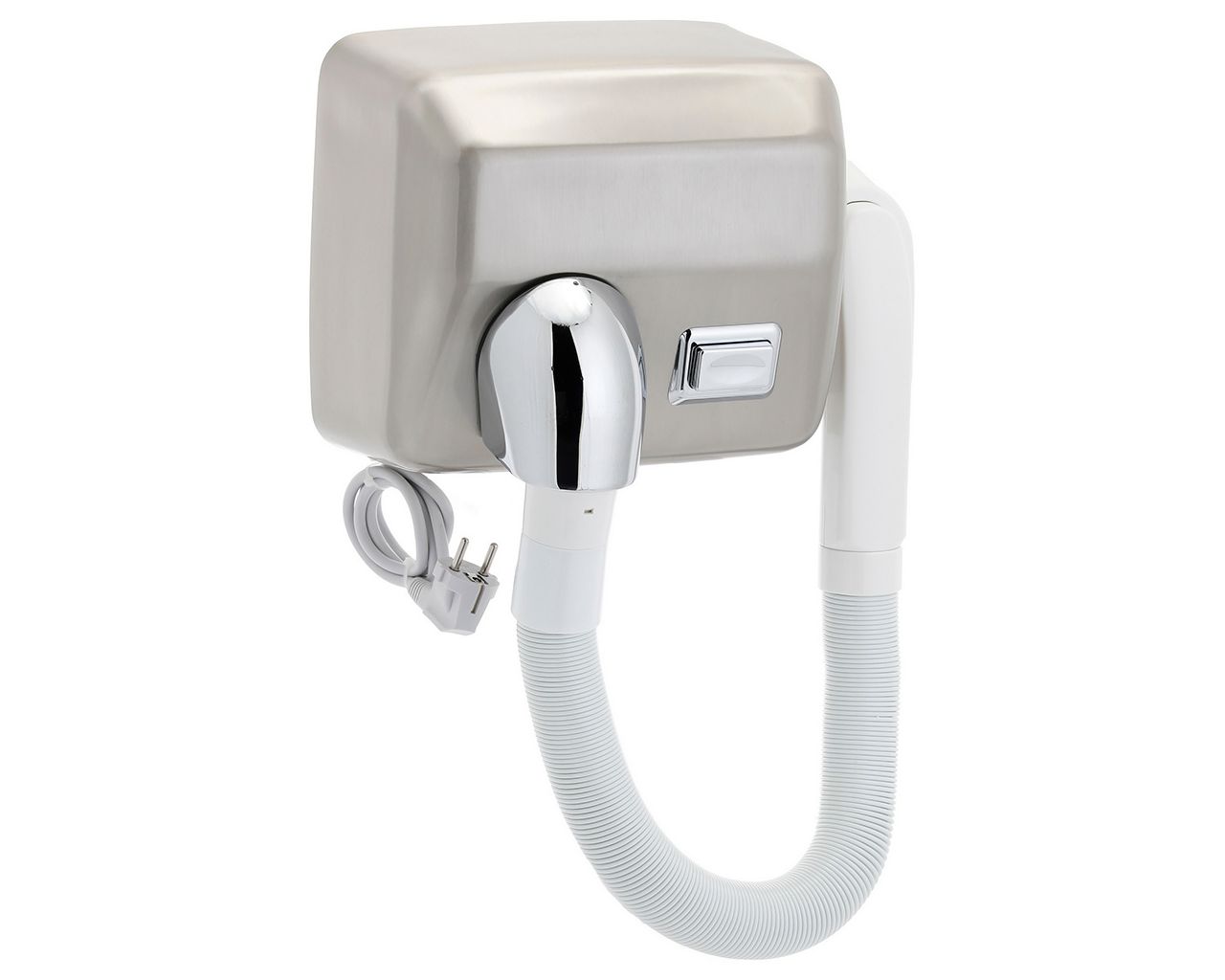Bezpieczna i niezawodna suszarka do włosów. stalowa obudowa, matowa. Wąż i dysza wykonana z wysokiej jakości tworzywa sztucznego. Podwójna ochrona przed przegrzaniem zapewnia trwałość urządzenia. Podczas suszenia należy zdjąć końcówkę węża z dyszą i przycisnąć włącznik, suszarka uruchomi się i wypuści strumień ciepłego powietrza. Suszarka wyłączy się automatycznie po 35 sekundach ciągłej pracy. Po ponownym przyciśnięciu włącznika, suszarka uruchomi się jeszcze raz. Jest to idealny wybór do toalet, łazienek publicznych, basenów, itd.