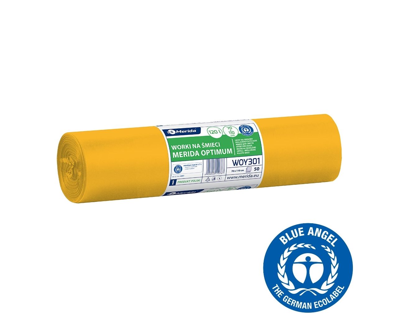 Worki na śmieci 120 lMERIDA OPTIMUM BLUE ANGEL, żółte, 70×110 cmrolka 50 szt.